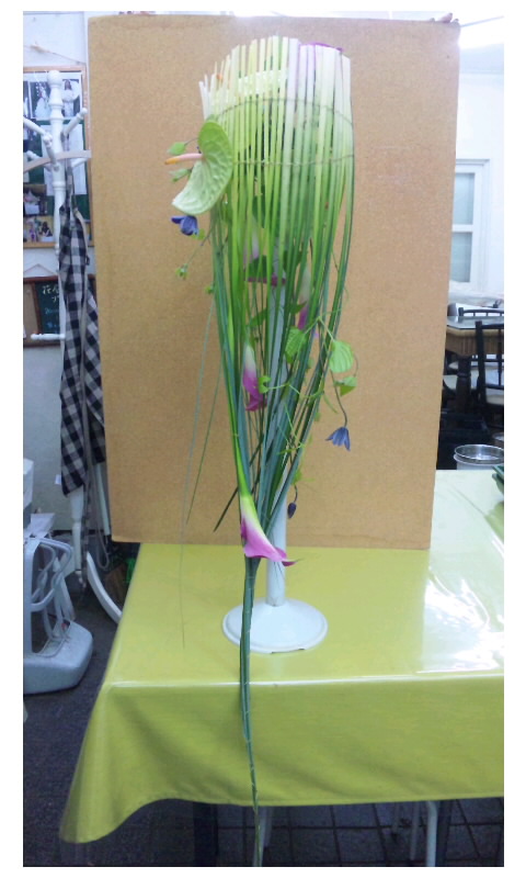 カラー。一本目は花は外へ、刺し口は中へ。切り口から指一本上がったとこら#26クロス、#24インソーション、もしくはセロテープを巻いてグルーのどちらかでオアシスに固定。二本目は少し短く中へ。三本目は上に残り2本は中へ。ベアグラスに添うように。